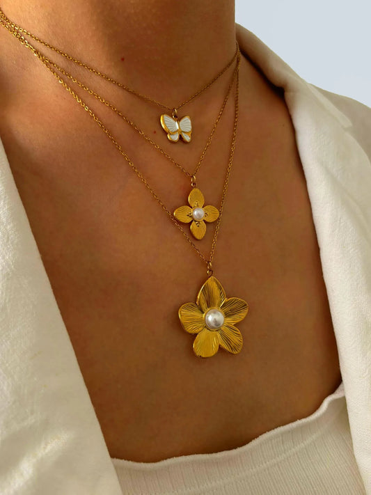 Flower Butterfly 316L Stainless Steel Imitation Pearl Enamel 18K Gold Plated Chain Necklace