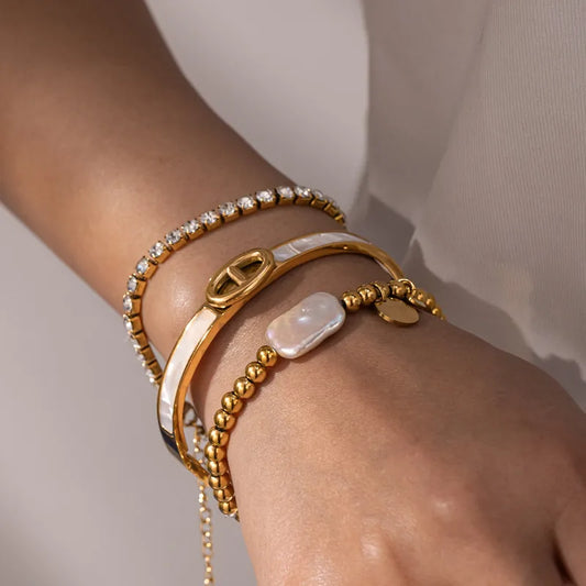 Geometric Mother of Pearl Electroplated 304 Stainless Steel 18K Gold Plated Bangle