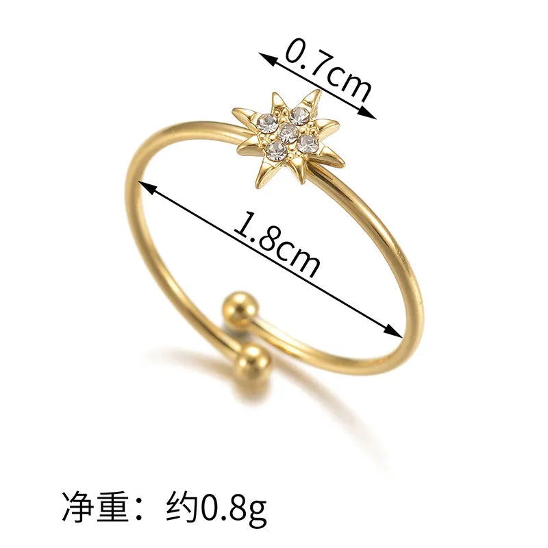This elegant ring is made of durable 304 stainless steel and features a starburst design. The 18K gold plated finish adds a touch of luxury to the overall look. Feel confident and stylish with this elegant and durable piece of jewelry.