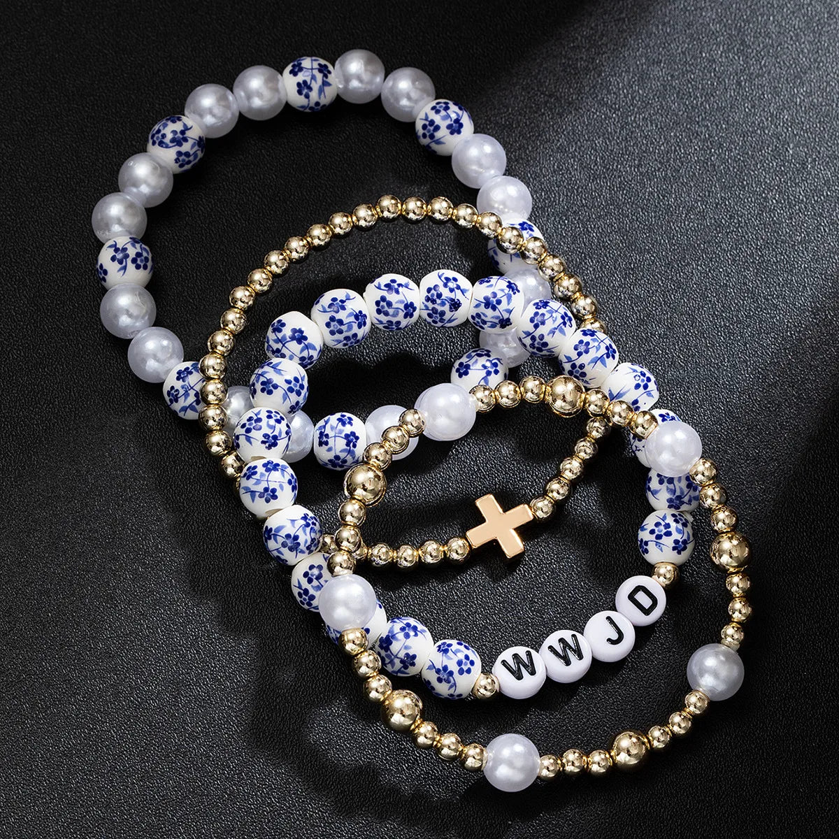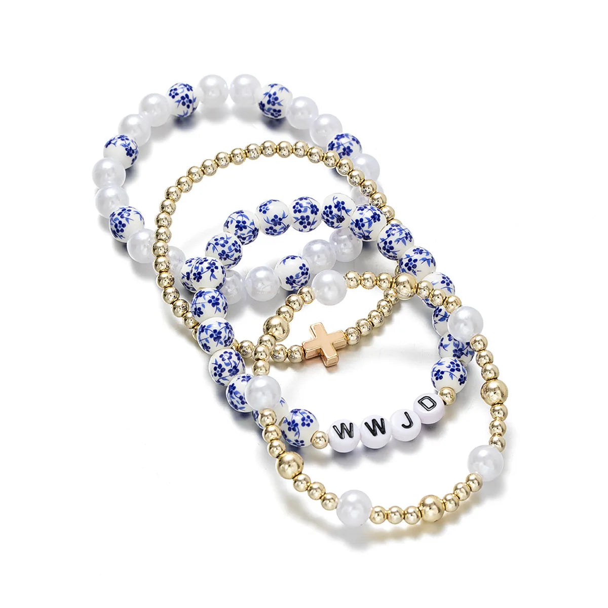 Antique Cross Ceramic Imitation Pearl CCB Multilayer Elastic Bracelet WWJD(What Would Juses Do)