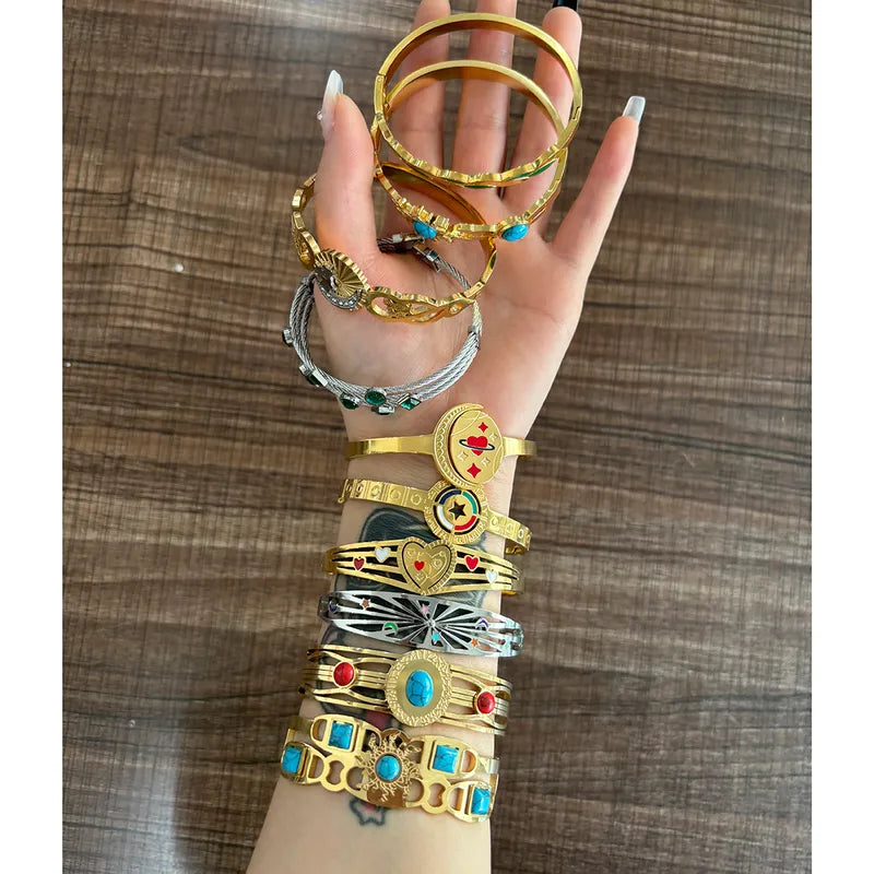 Beach Tropical Artistic Sun 304 Stainless Steel 18K Gold Plated Natural Stone Bangle