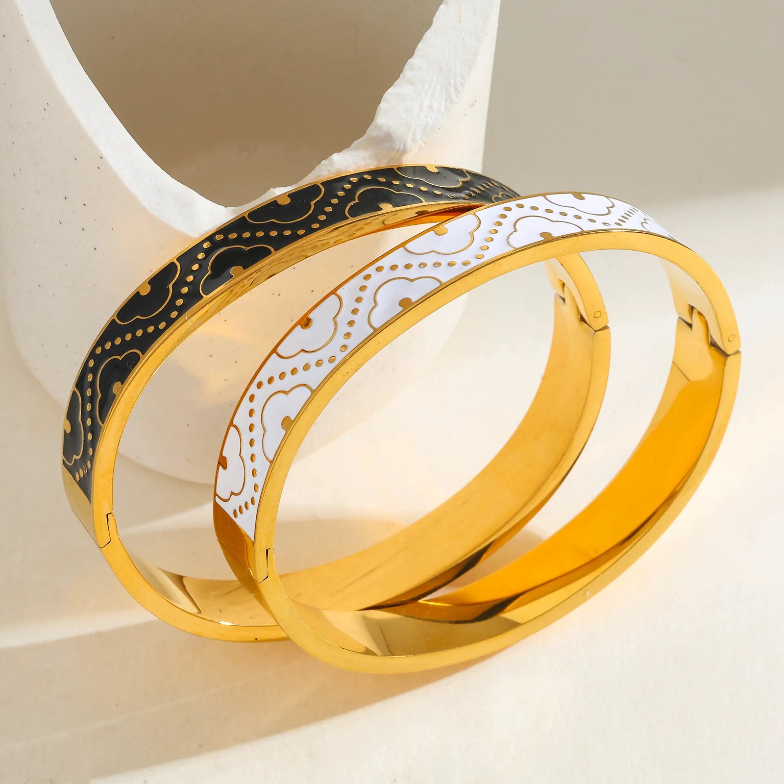 This sophisticated bracelet showcases an intricate clover motif rendered in contrasting black and white, crafted from premium 304 stainless steel with an 18K gold plating. The broad design delivers substantial presence on the wrist while maintaining refined elegance. The durable stainless steel construction resists tarnishing and daily wear, ensuring your investment remains lustrous for years. Perfect for those who appreciate symbolic jewelry with meticulous detailing and lasting quality.