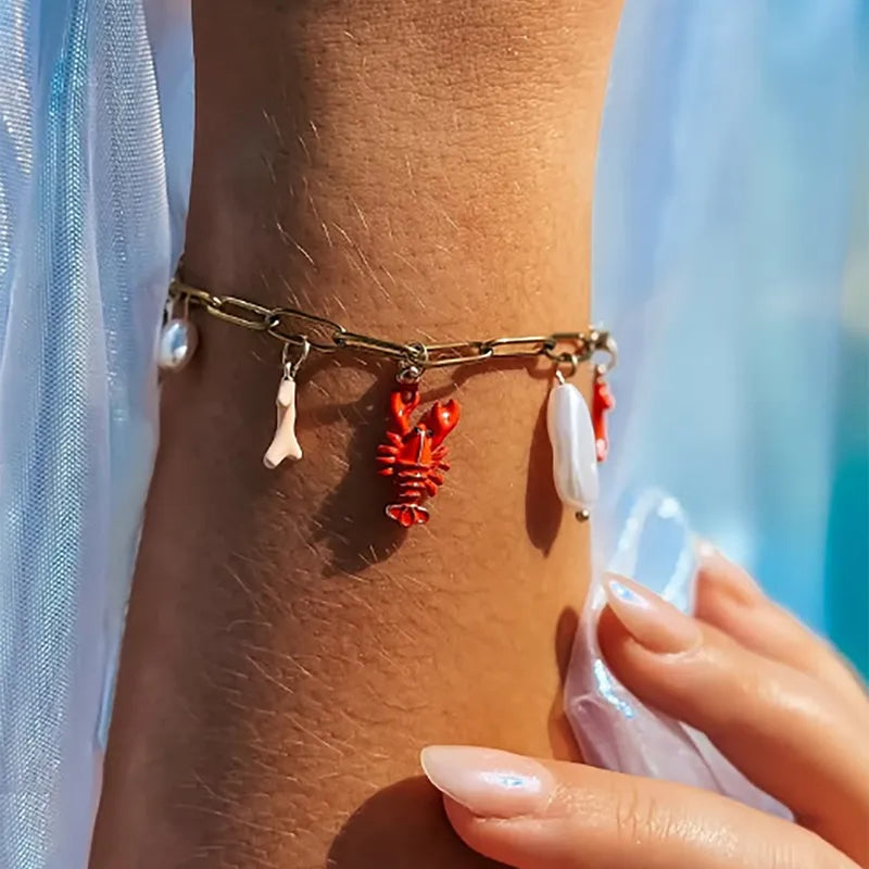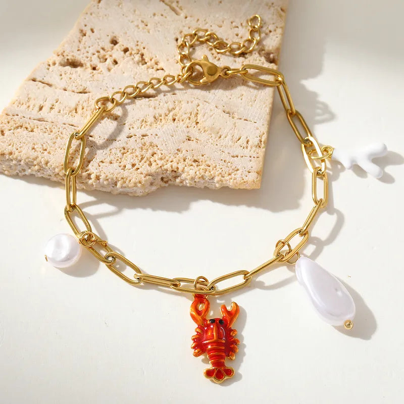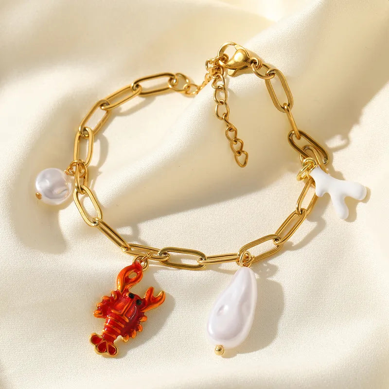 Coral Lobster Rouge 304 Stainless Steel 18K Gold Plated Imitation Pearl Paperclip Chain Multi Charms Bracelet