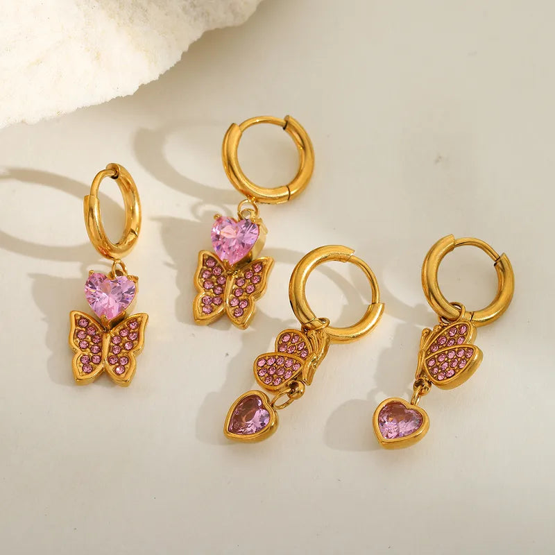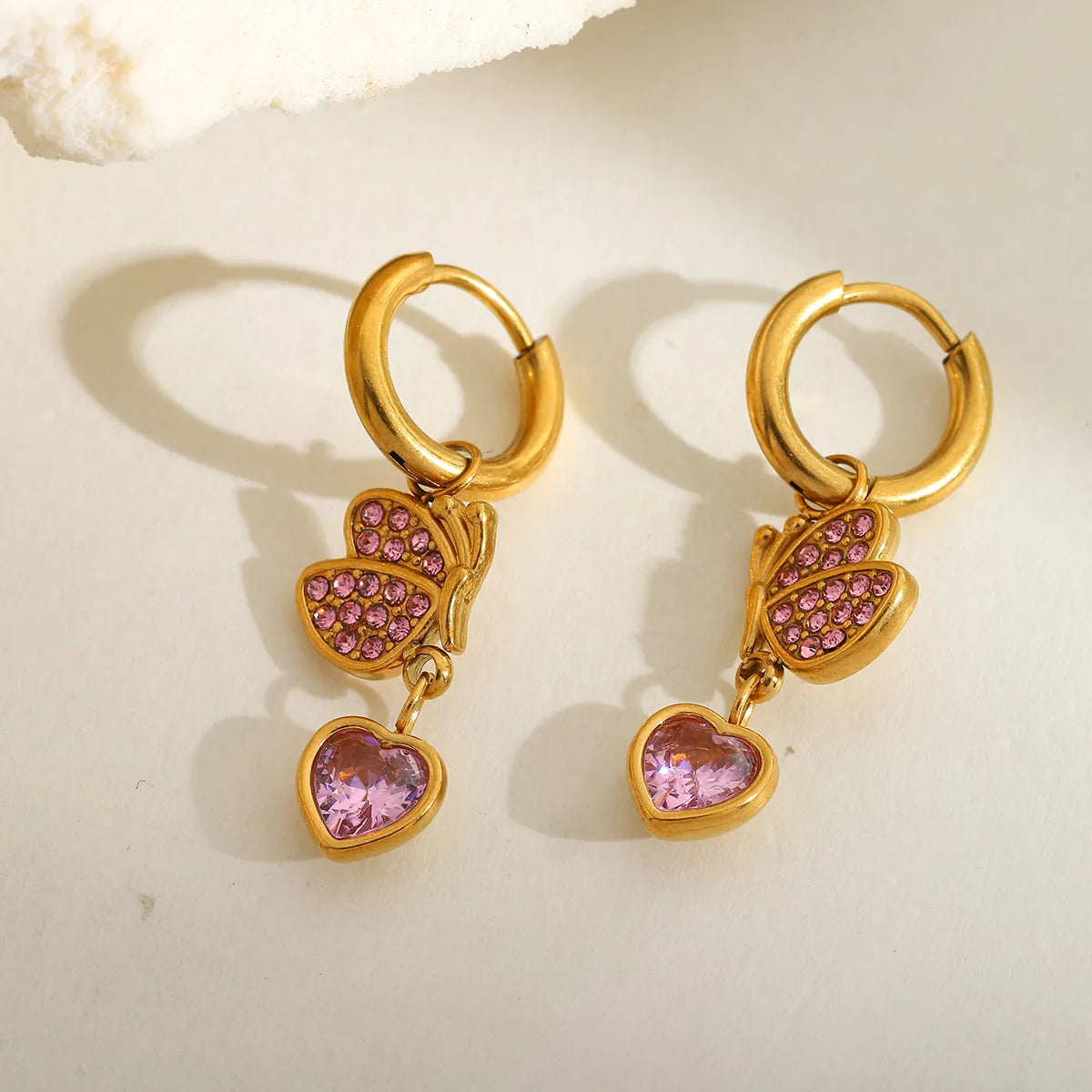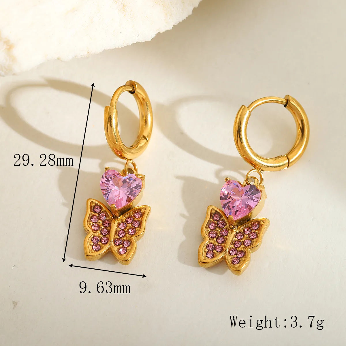 Heart Shape Butterfly Plating 304 Stainless Steel Zircon 18K Gold Plated Drop Earrings