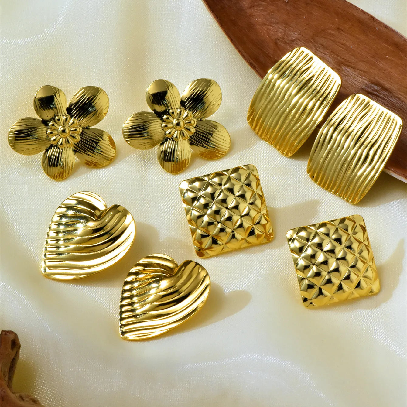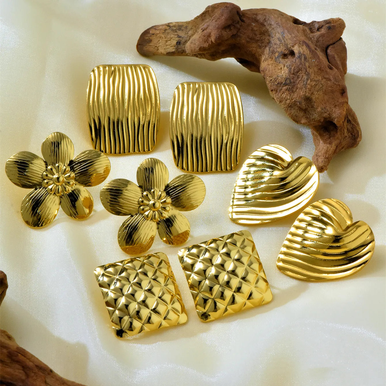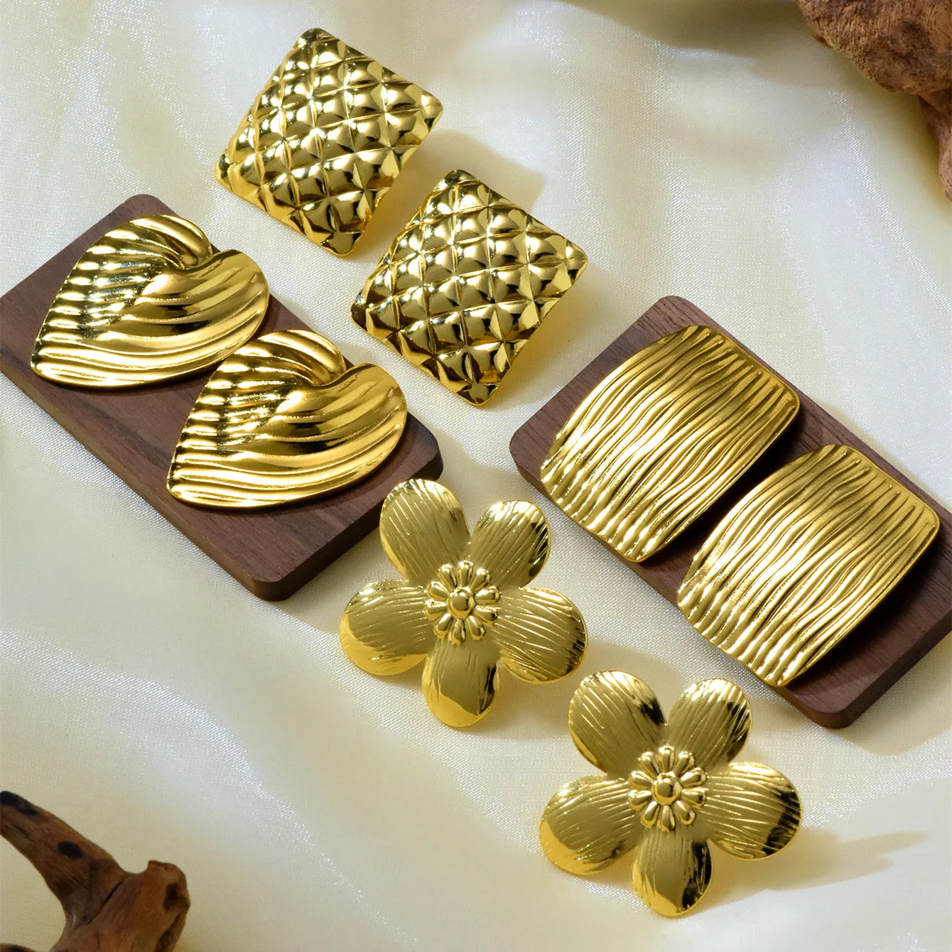 Crafted from premium 304 stainless steel with an 18K gold plating, these vintage-inspired ear studs deliver timeless elegance with modern durability. The irregular design adds distinctive character, making them versatile enough to complement casual everyday wear or elevate formal occasions. Hypoallergenic and tarnish-resistant, they maintain their lustrous finish through regular wear. A sophisticated accessory that transitions seamlessly from day to night.