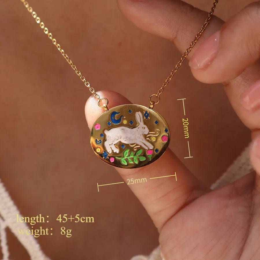 Lucky Rabbit 304 Stainless Steel Zircon 18K Gold Plated Enamel Pendant Necklace