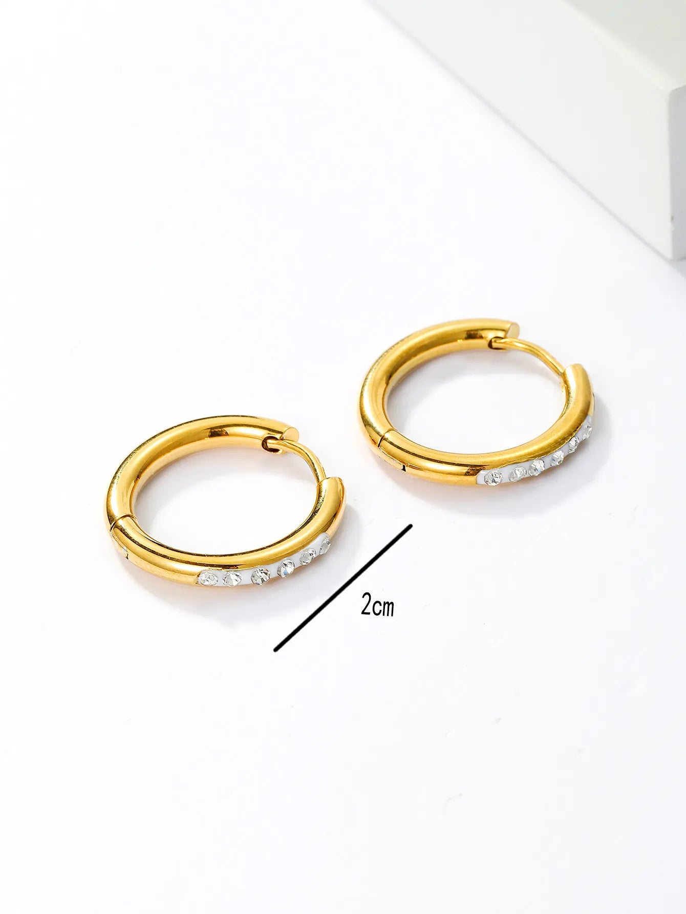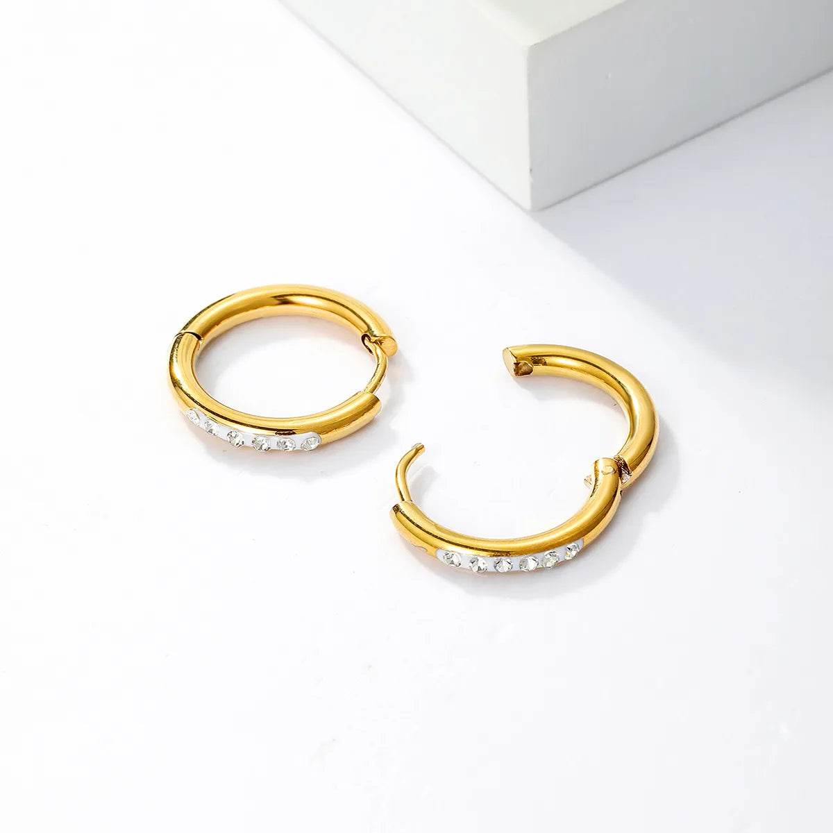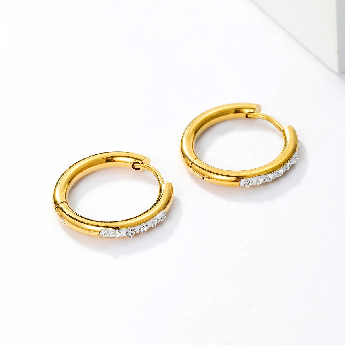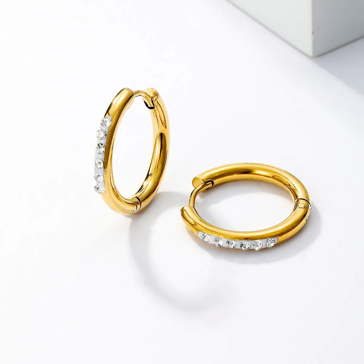 Pair Cool Style Circle Stainless Steel 18k Gold Plated Rhinestones Hoop Earrings