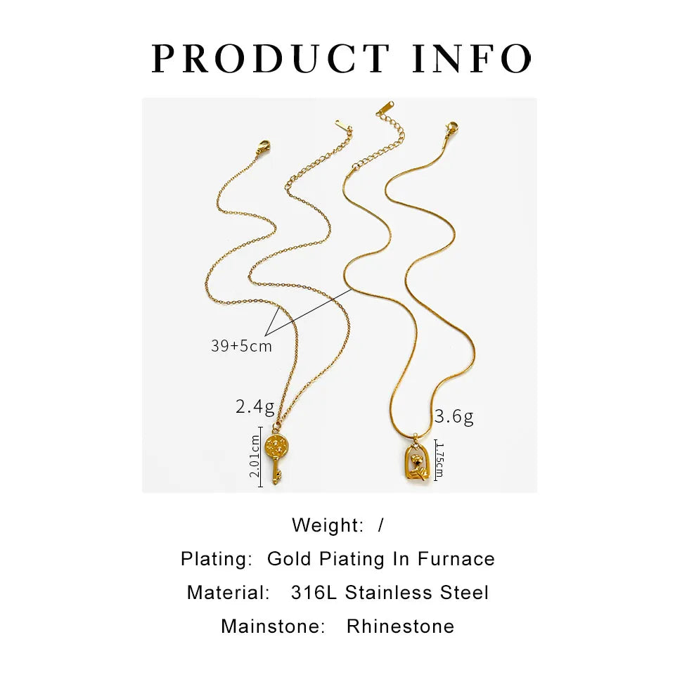 Rose Flower Key 316L Stainless Steel Rhinestones 18K Gold Plated Three-dimensional Cable Chain Snake Chain Pendant Necklace