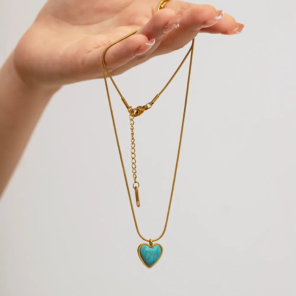 Stainless Steel 18K Gold Plated IG Style Inlay Heart Shape Turquoise Pendant Necklace