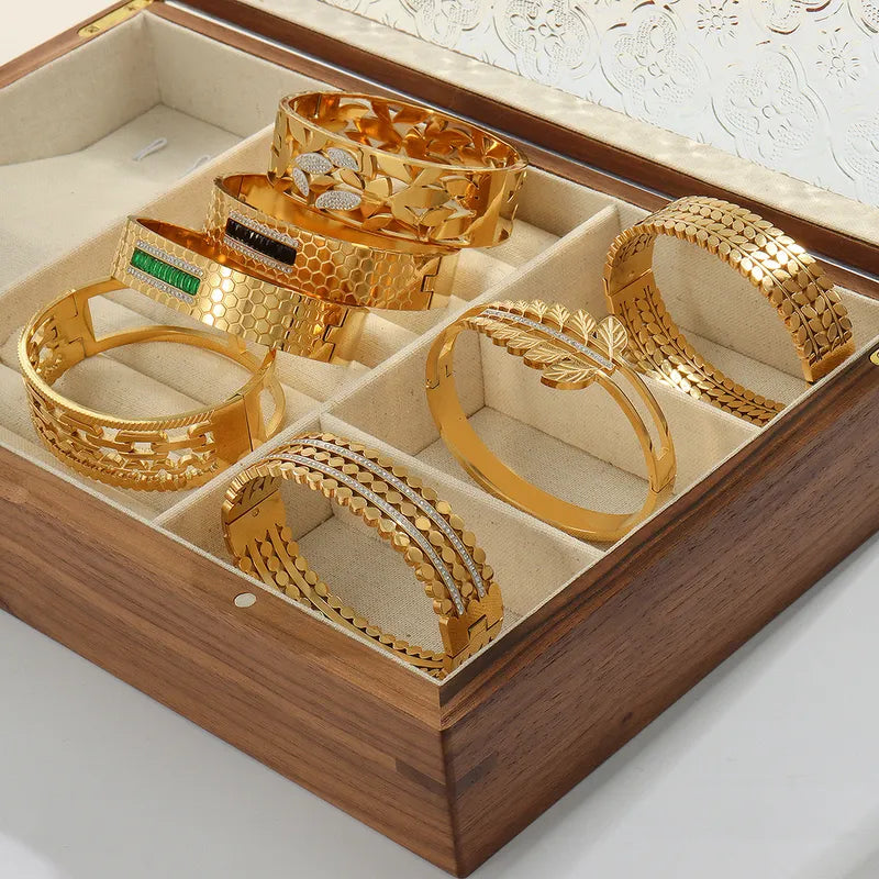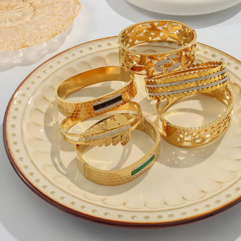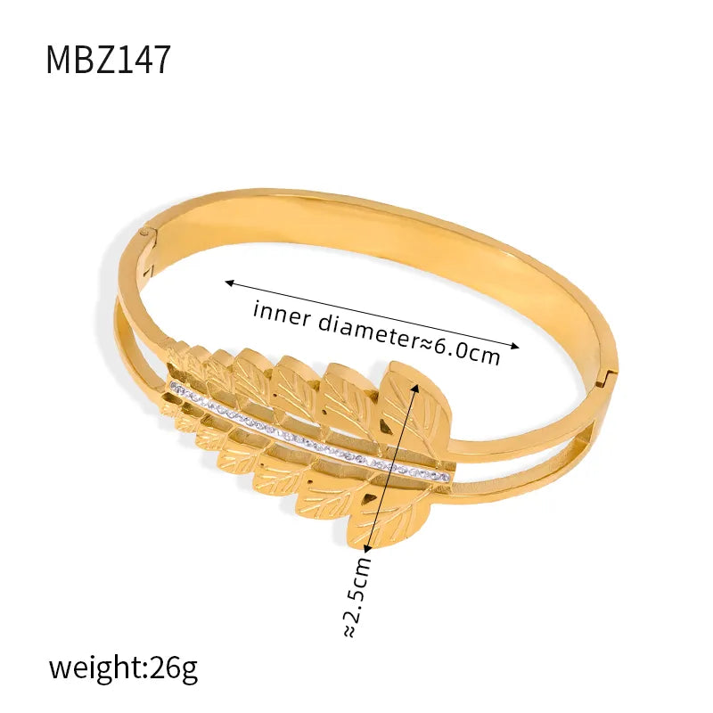 This elegant Titanium Steel 18K Gold Plated Bangle features a simple style with layered inlay rhinestones. The leaves design adds a touch of sophistication and the solid color makes it perfect for any occasion. Made from high-quality materials, this bangle is both durable and stylish. Elevate your casual attire with this must-have accessory.