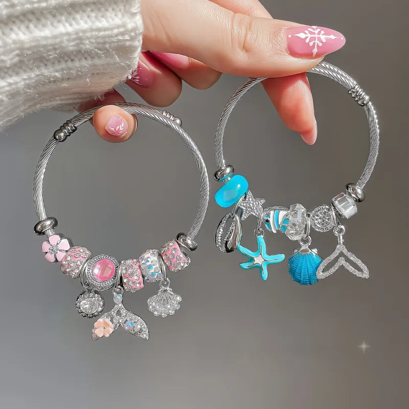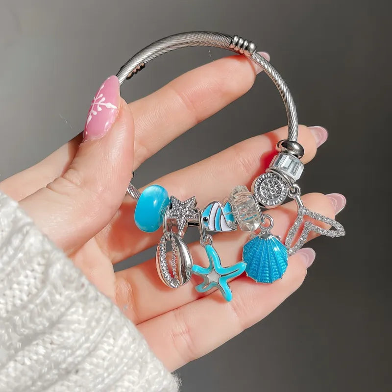 Under Sea Blue Charm Stainless Steel Bracelet Diamond-encrusted Beaded Fishtail Shell Love Pendant Adjustable Girlfriend Bracelet