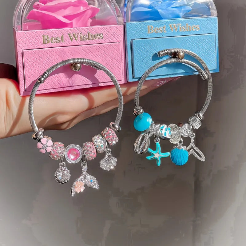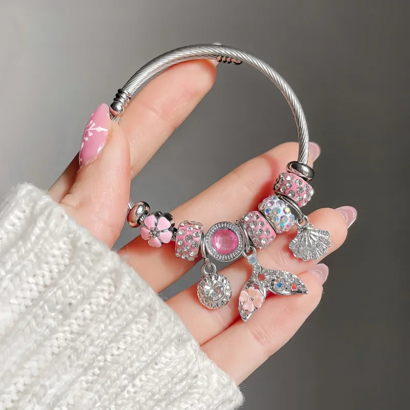 Under Sea Pink Charm Stainless Steel Bracelet Diamond-encrusted Beaded Fishtail Shell Love Pendant Adjustable Bracelet